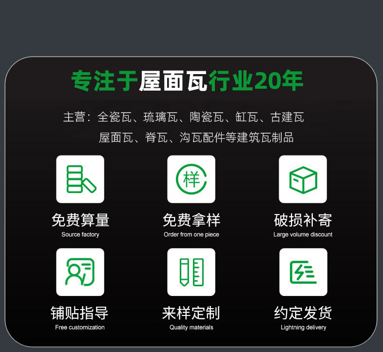 专注于屋面瓦行业20年,主要生产品种有“欧式连锁瓦”“全角屋面瓦”“全瓷异型瓦”,“全瓷连锁瓦”“各种规格